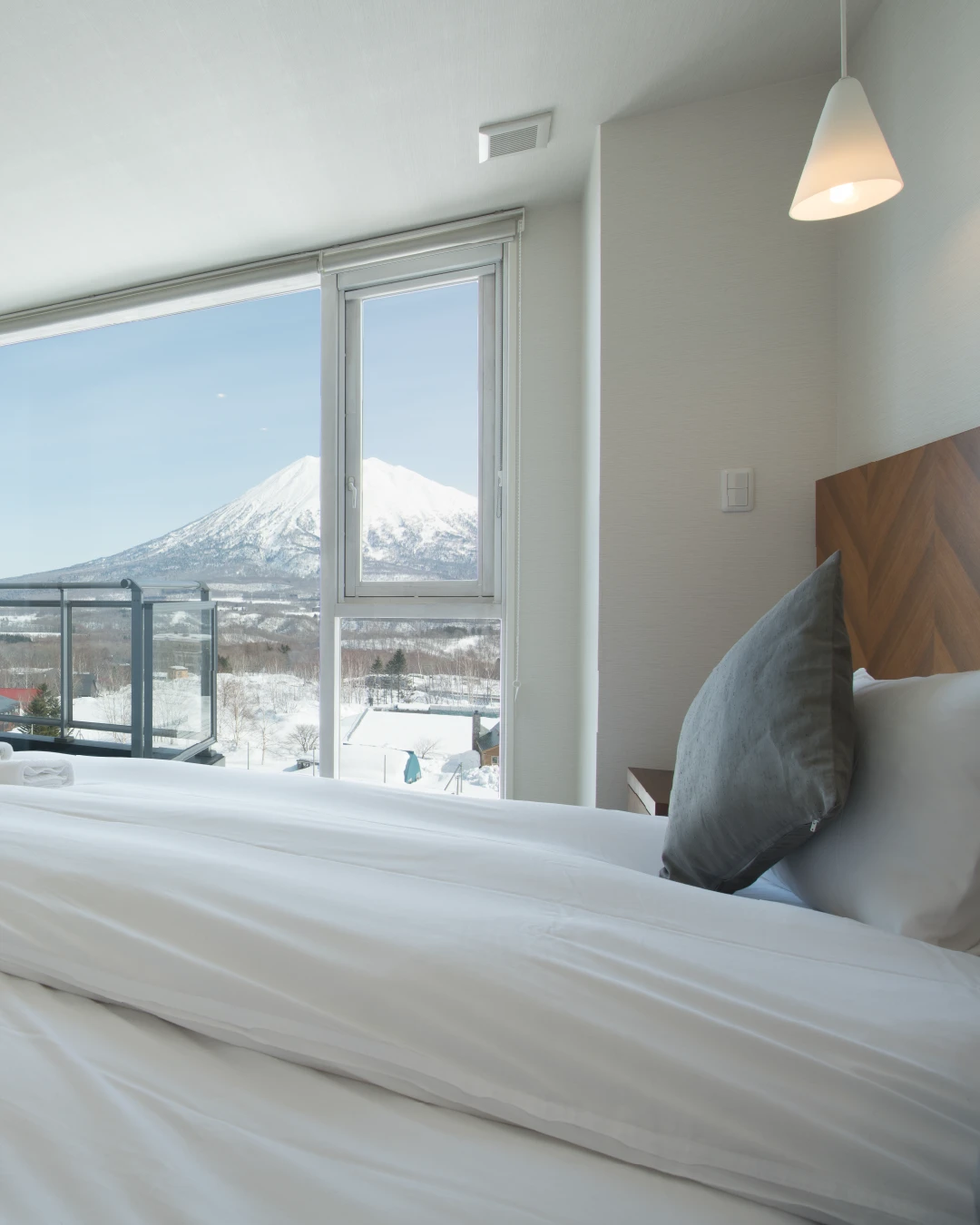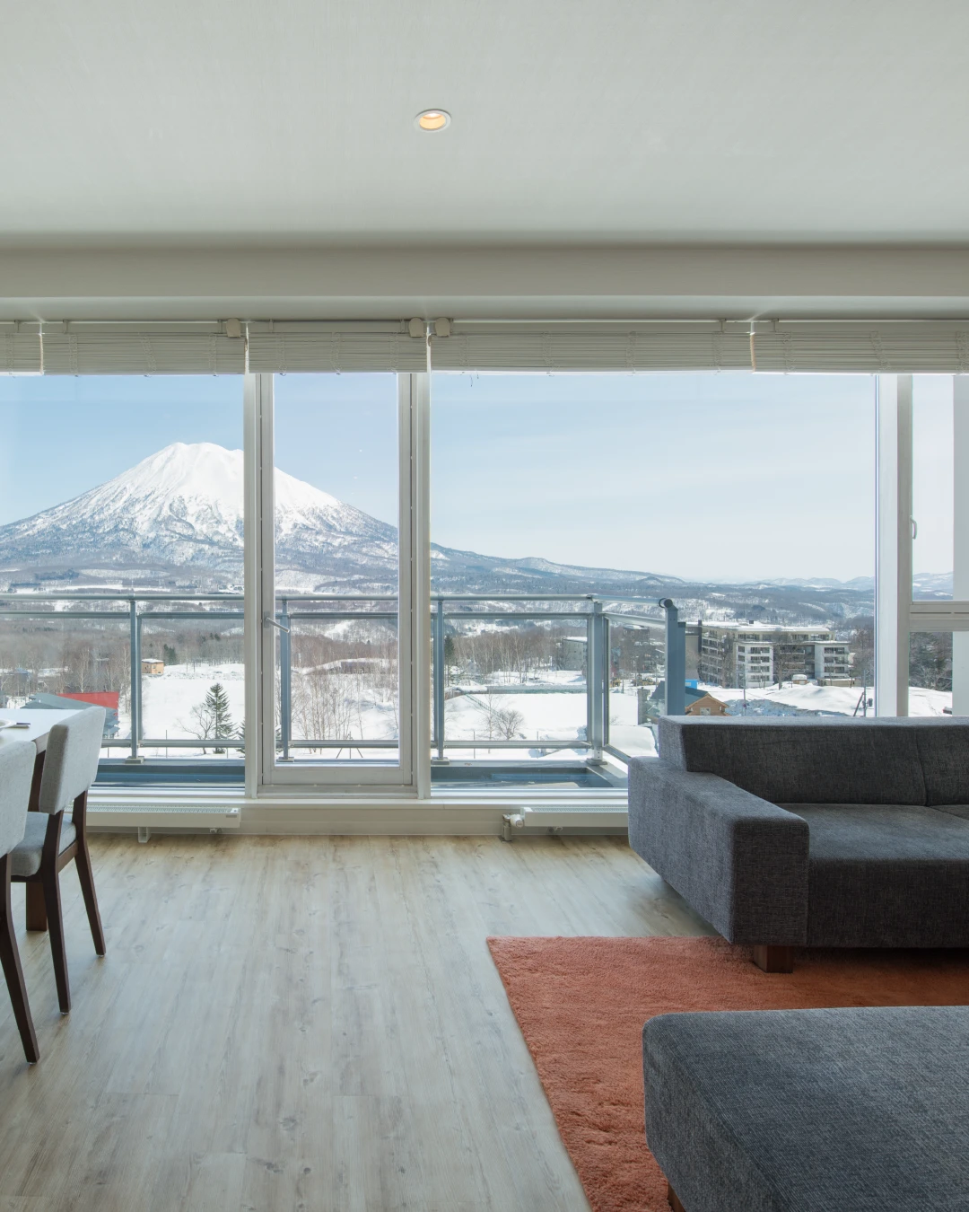 Perched on floors 4 – 6, these comfy units with floor to ceiling windows offer stunning views of Mt. Yotei on a sunny bluebird day.