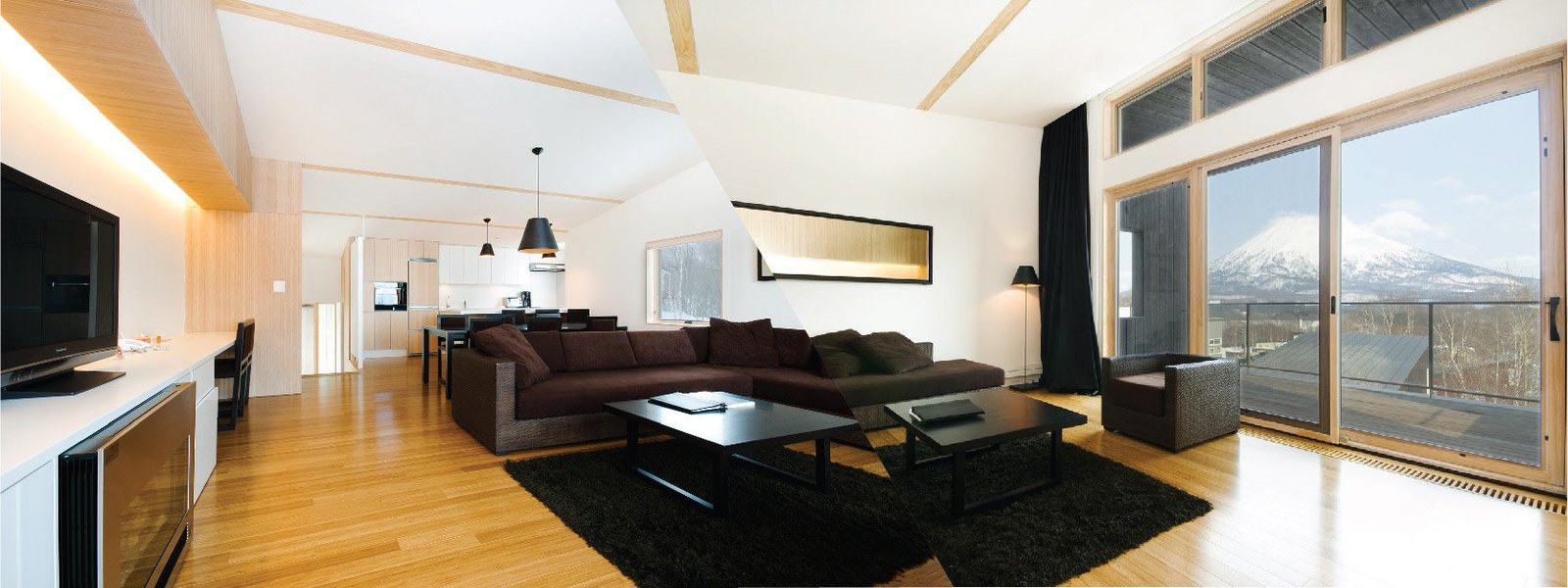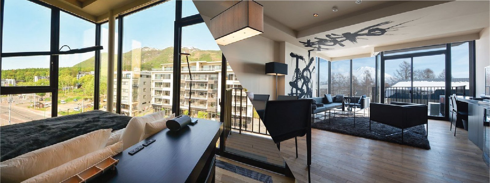 2 or 3 Bedroom apartments overlooking Mt Yotei. Modern, scandi-inspired interiors and luxe furnishings. Located in the quiet lower Hirafu village area for peaceful surroundings but proximity to everything you need. Master bedrooms include a desk and armchairs in the living rooms offer a comfortable workspace.
