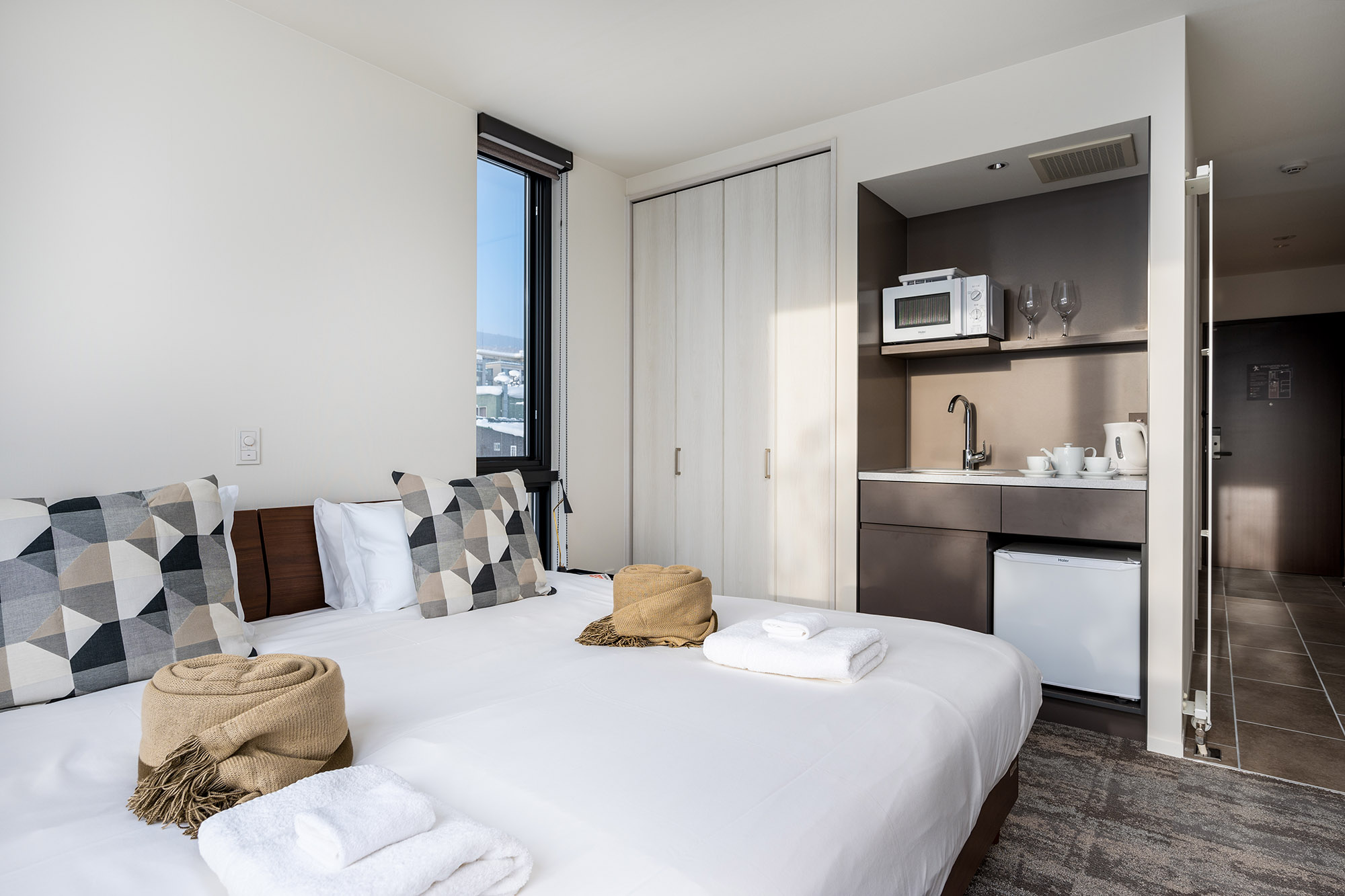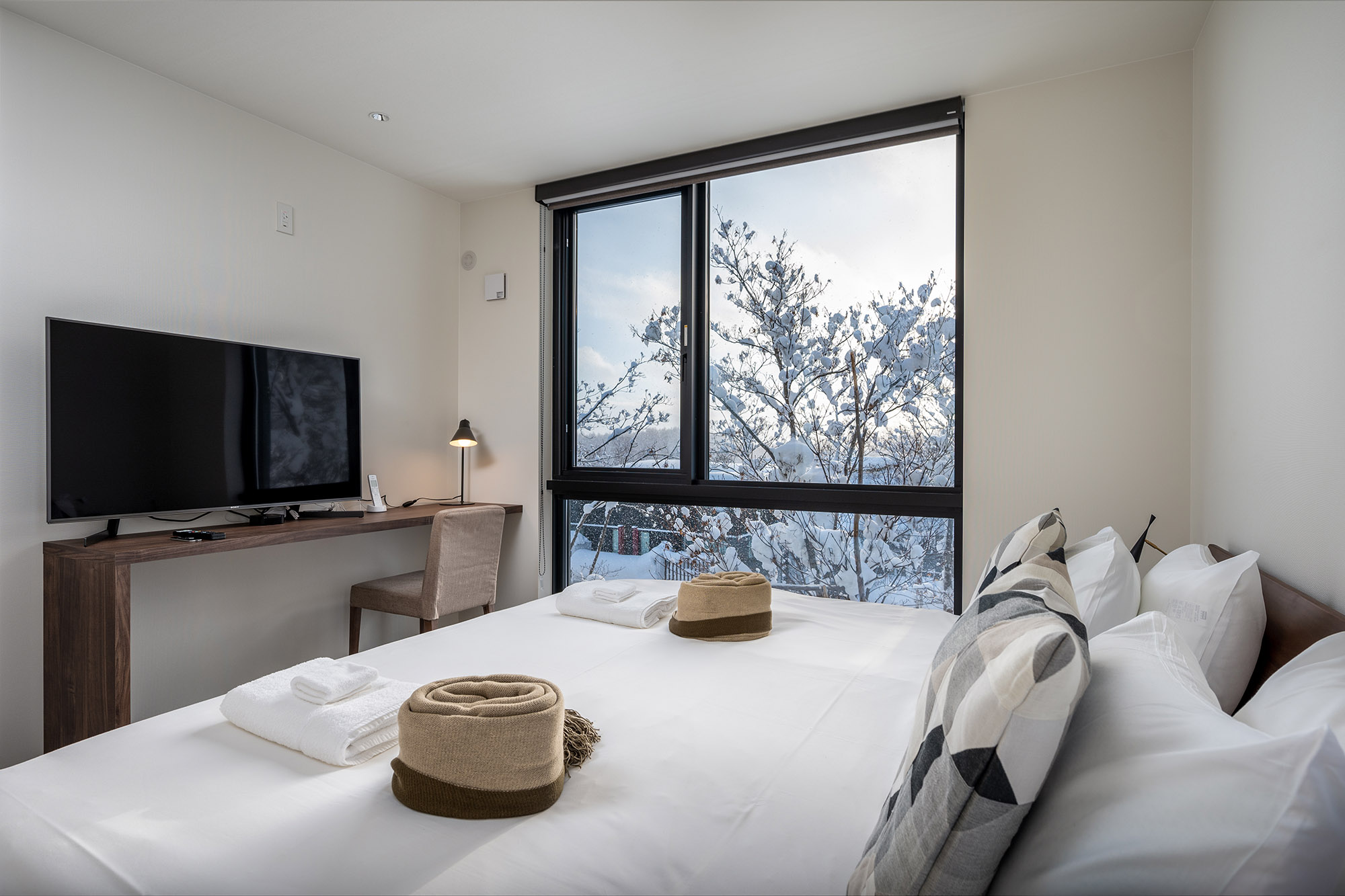 2ベッドルームには快適なリビングエリアと本格的なキッチンが備わり、建物の羊蹄山側には広めのバルコニーがあり、美しい景色を楽しめます。スタジオタイプには簡易キッチンとワイドスクリーンテレビがあり、カジュアルな滞在に最適です。