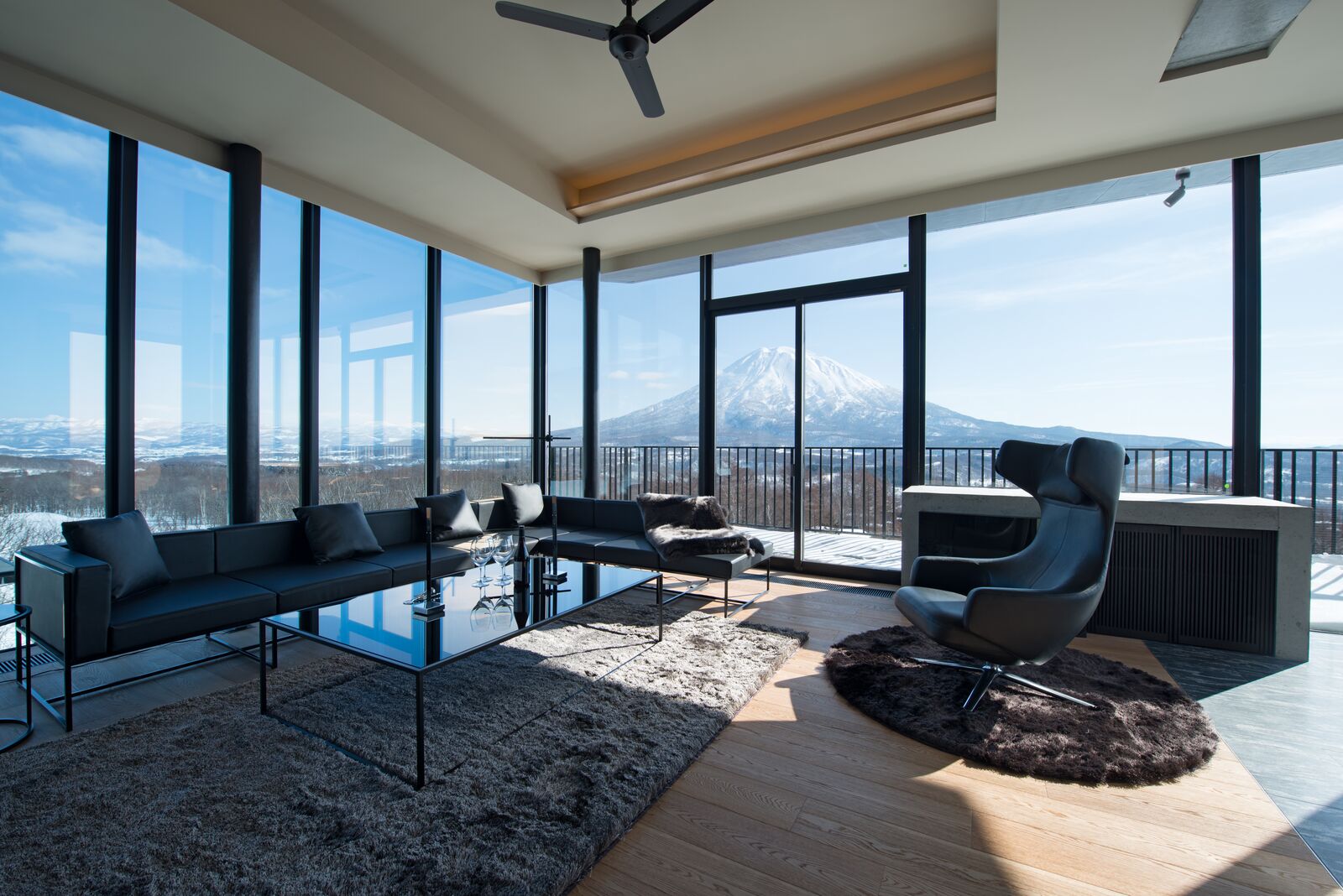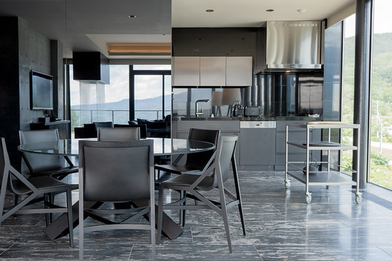 広々としたリビングルームからは羊蹄山の素晴らしい景色をお楽しみいただけます。オープンキッチンの鉄板テーブルでワンランク上のホームパーティーを。