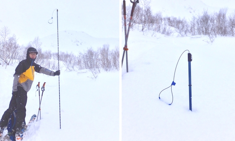 地形がまだ埋まっていない沢では枝を掻き分け歩くのがつらい、、とりつき近くの場所で少し休憩。ゾンデでどのくらい雪が積もっているか見てみると2m50cmを超えている!